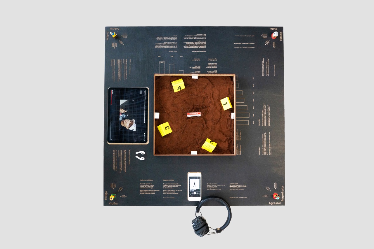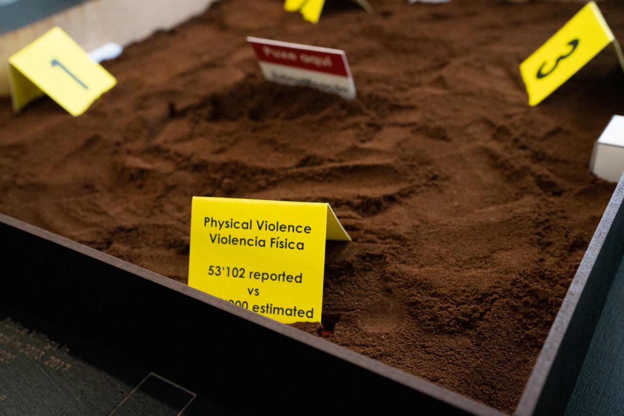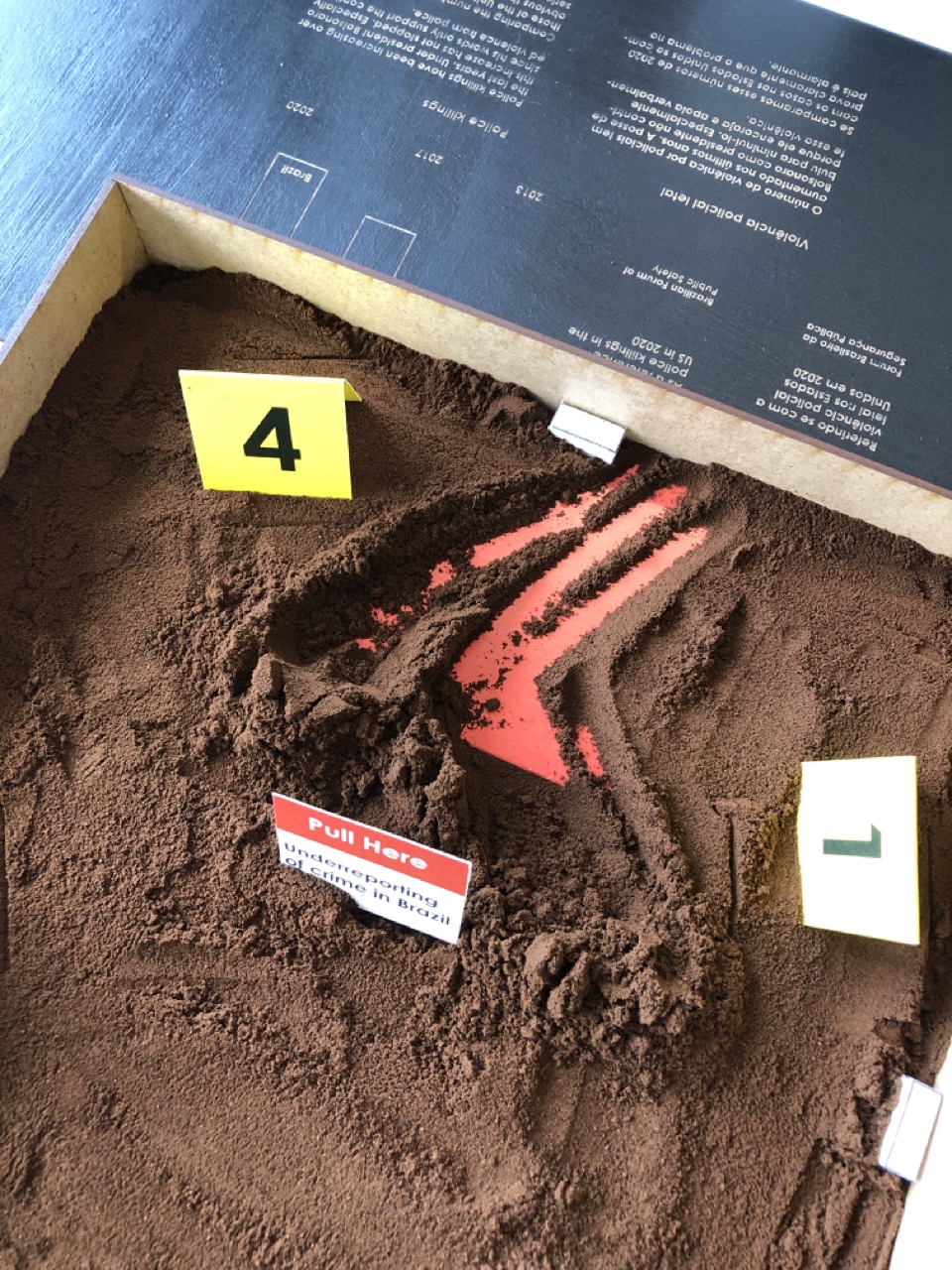 In the center of the board one fill find a ‘sand box’ that contains boxes corresponding in size to the number of crimes committed, white higher ones for the reported ones and red lower ones for the dark figure. The red boxes were covered in ground coffee to let the spectator uncover the dark figure by himself in removing the coffee from around the visible white boxes. In the center of the ‘sand box’ there is a informational piece, or pillar, that can be pulled upwards, revealing the overall estimated dark figure in crime in general, as well as offering a short explanatory text offering an input into the board and how it is supposed to be handled.