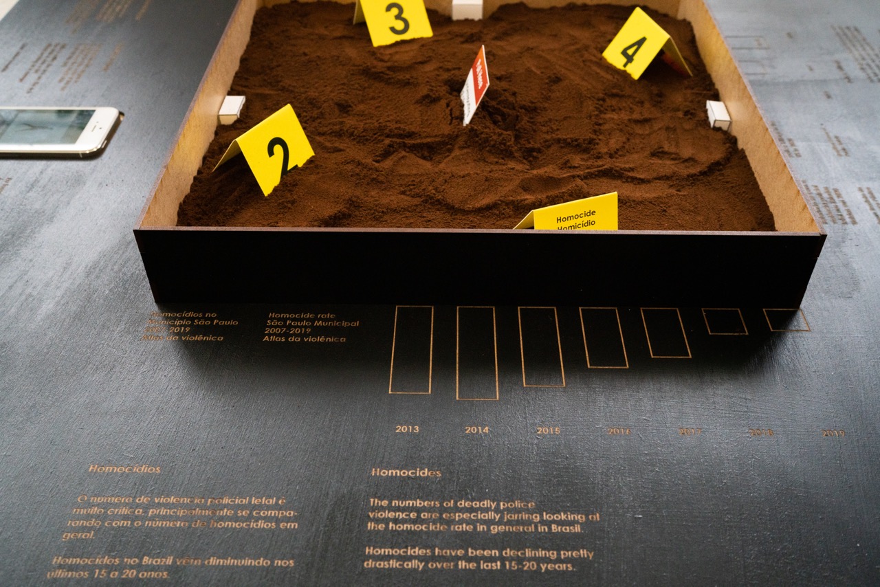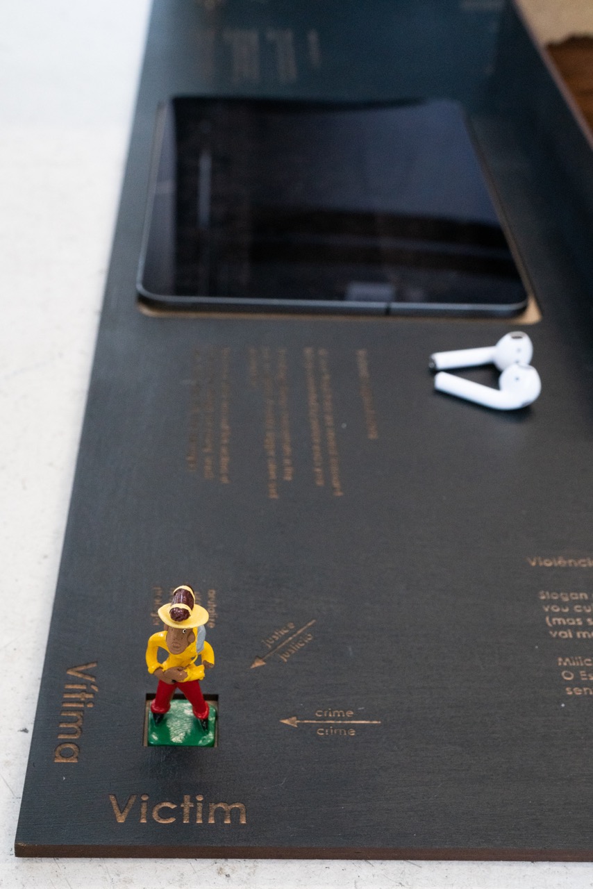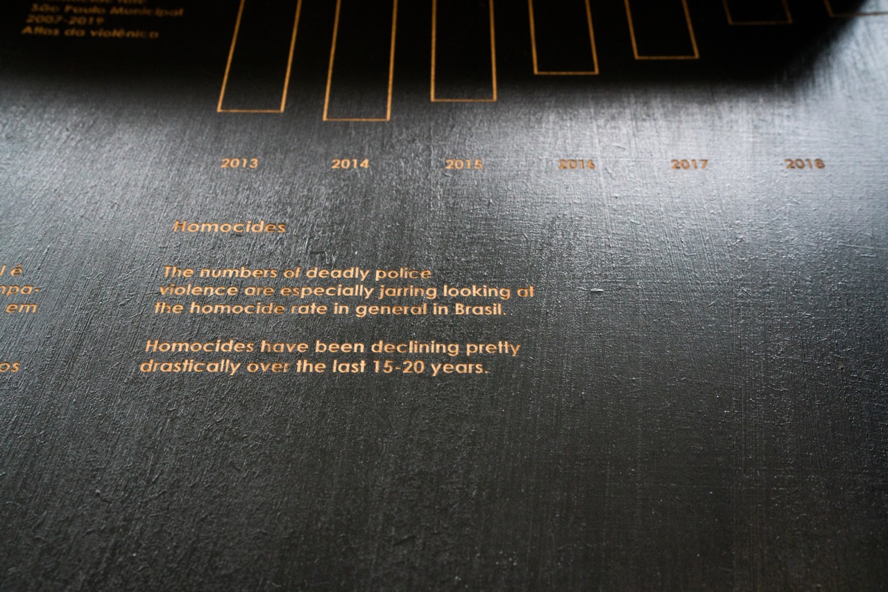 The infographic constituted out of a 80x80 cm MDF board that was coated in black paint and subsequently lasered to display the information. In addition there are a iPad playing a video showing mothers of deceased young men, fallen victim to police brutality, as well as an iPod playing music criticizing the current situation.