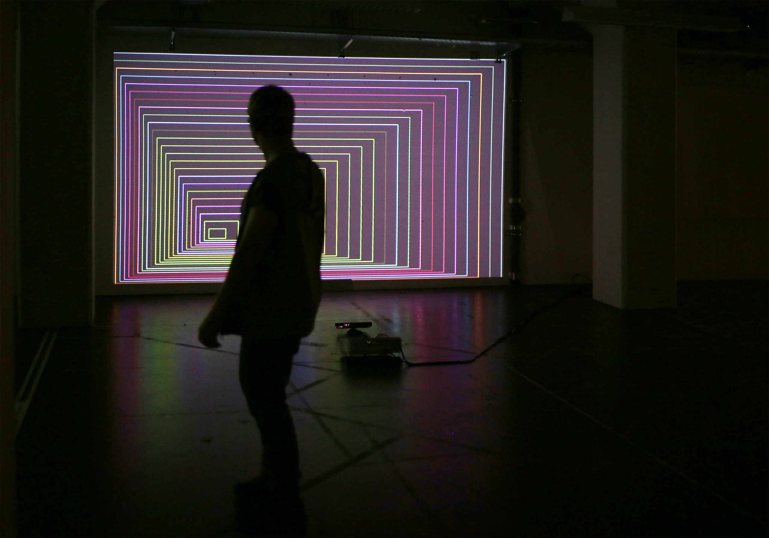 «What is real?» is an interactive installation that confronts the visitor with several visual experiments. By tracking the visitor's position in the room, the installation tries to blur the line between reality and illusion. Key element of the installation is a recreation of the hallway behind the wall. From certain positions in the room, the spread out letters can be read as coherent words and act as a kind of main menu to explore the different experiments, simply by moving in front of the projection.