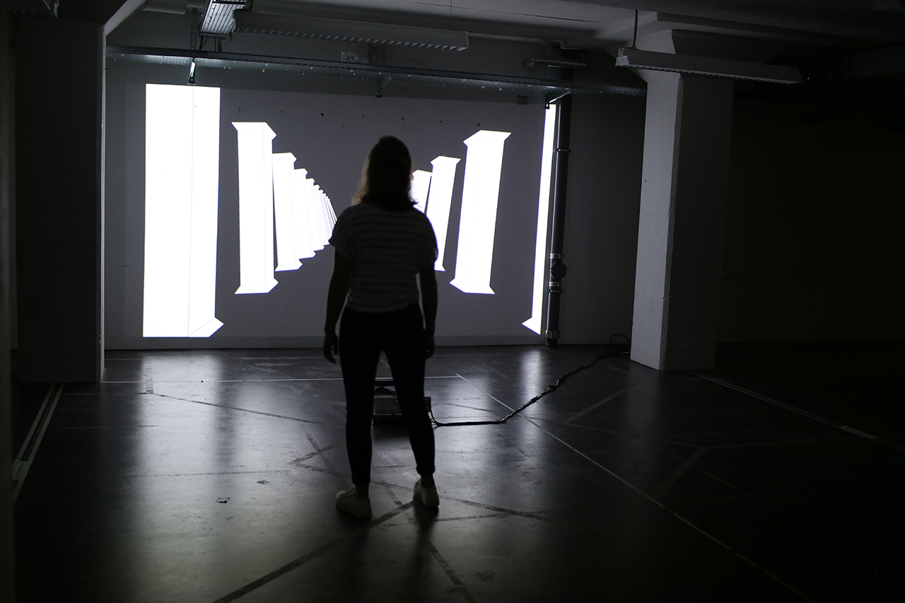 «What is real?» is an interactive installation that confronts the visitor with several visual experiments. By tracking the visitor's position in the room, the installation tries to blur the line between reality and illusion. Key element of the installation is a recreation of the hallway behind the wall. From certain positions in the room, the spread out letters can be read as coherent words and act as a kind of main menu to explore the different experiments, simply by moving in front of the projection.