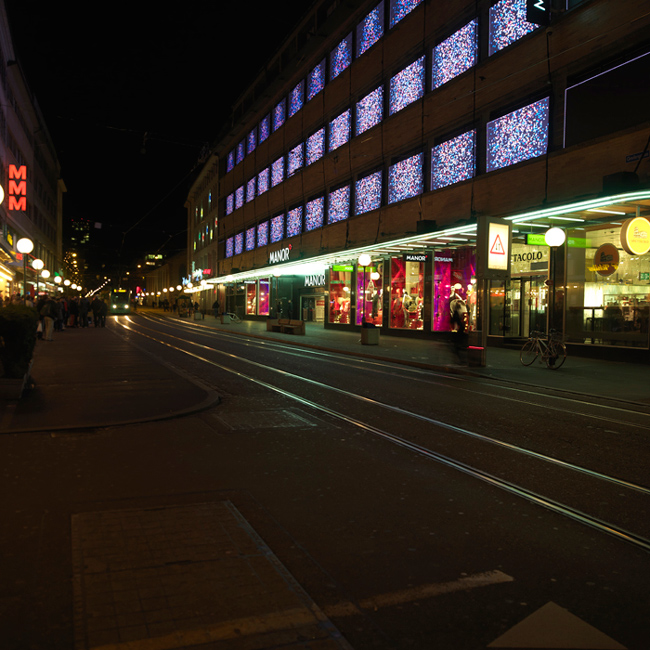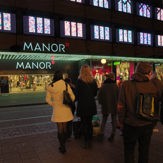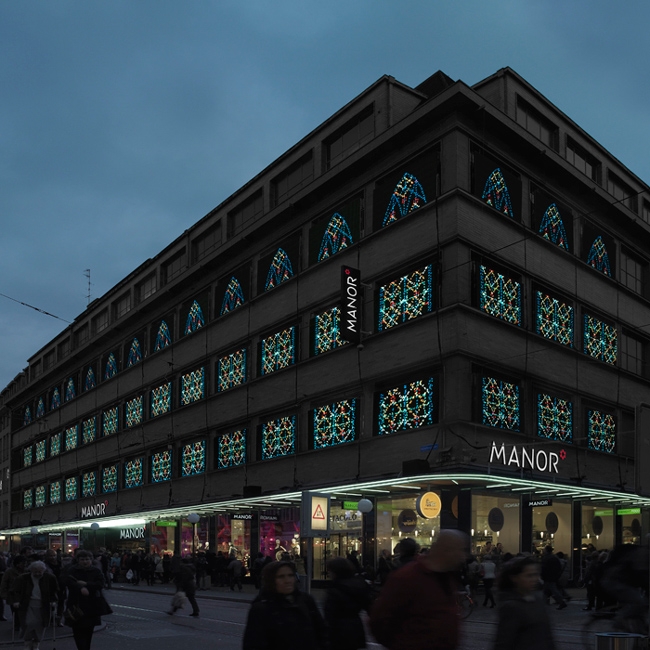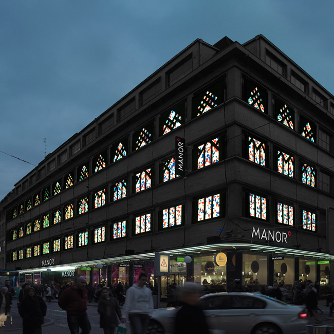 “Kathedrale” from Alexandra Kaufmann and Leila Kuenzer transforms the Manor building into a sparkling cathedral made from light, which abstracts stained glass windows from the Middle Ages. The result is a controversial combination of a department store and a church.