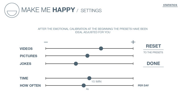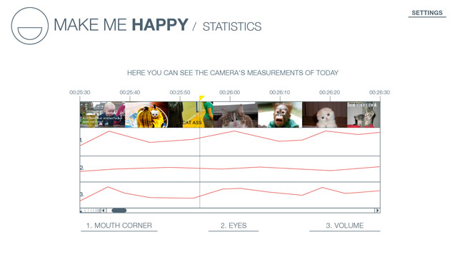 Based on these facts we developed “MAKE ME HAPPY”, a programme concept that makes you laugh while you’re at work. With the integrated webcam it measures your face activity during the day and knows when it’s time for you to laugh. We designed a concept for the interface and made a short film, which shows when and how the programme should be used. Additionally we developed a prototype in Processing, which simulates it’s function.