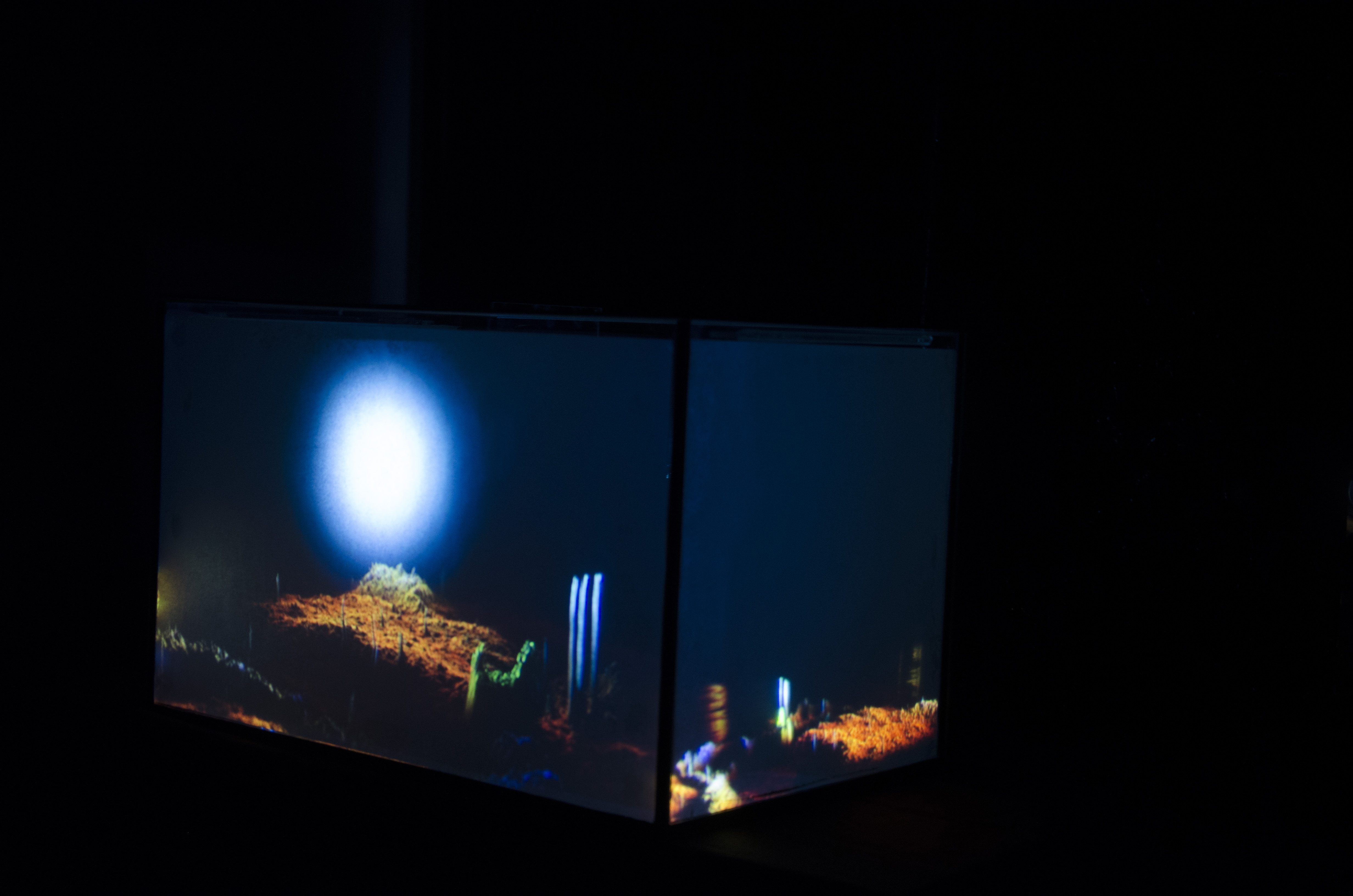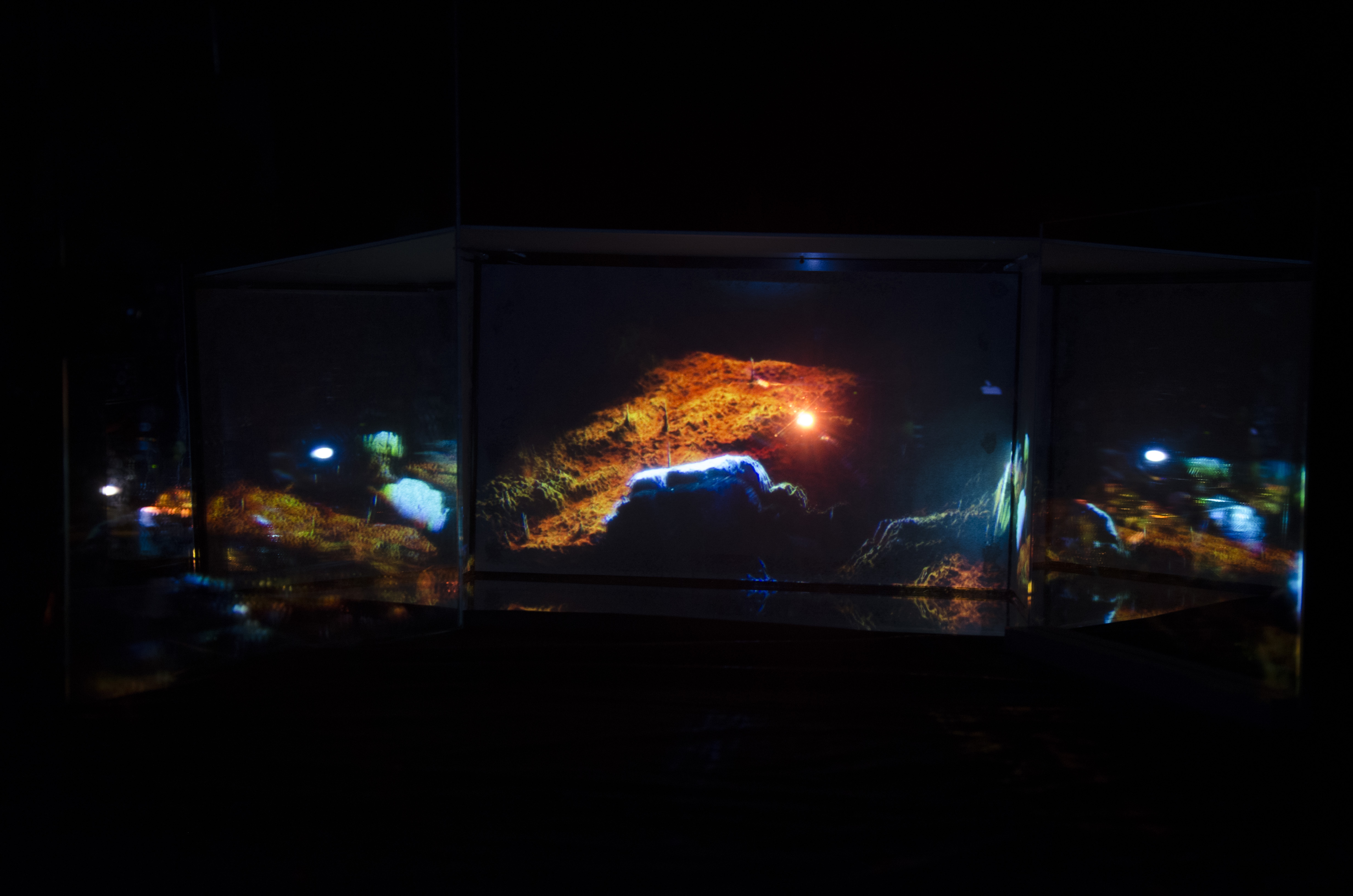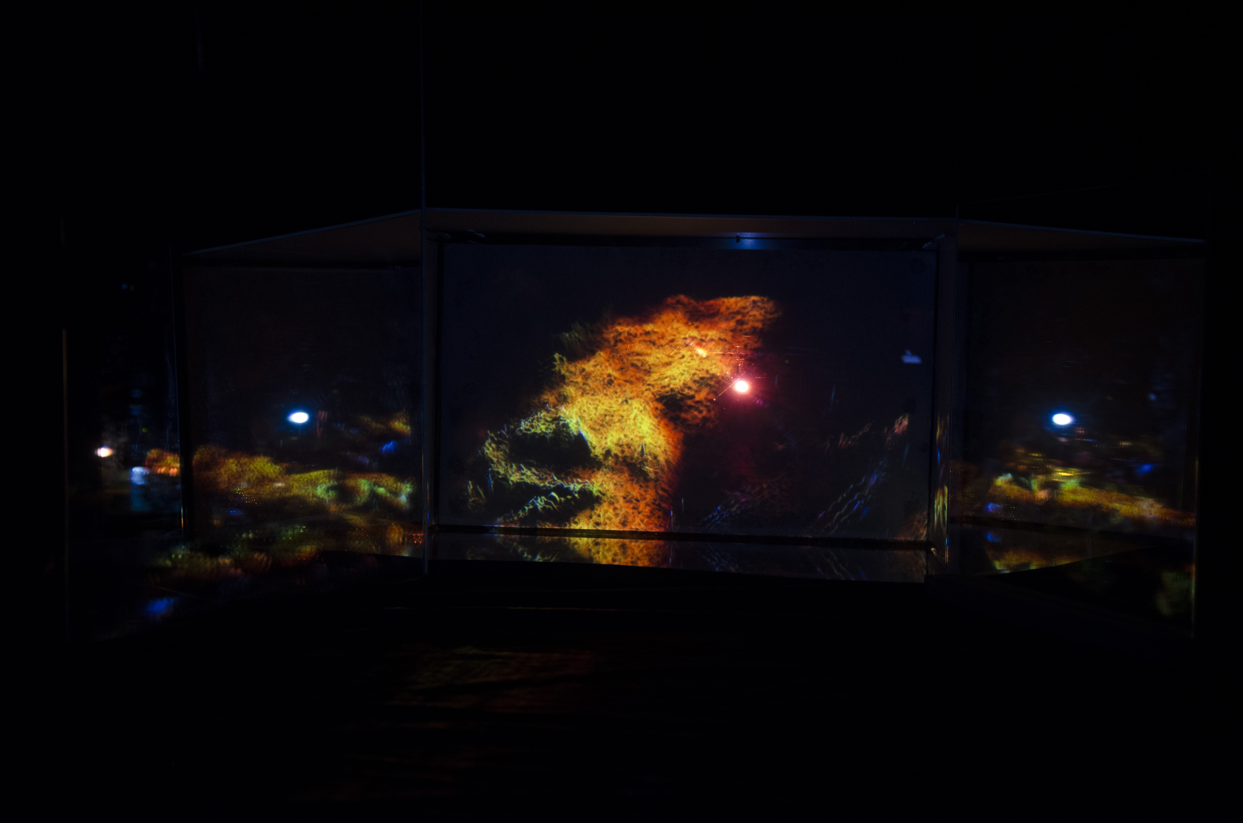 For three months I worked with an aquarium and many types of fishes. I spend a lot of time in zoo shops to buy everything for holding fishes. After that I filmed the fishes from the top and processed the video in Cinema 4D. With the help of the displacer transformer I could translate the videos to 3D objects that map pixel brightness to the vertical translation of vertices. After that, I created a camera movement through the generated geometry. Eventually, I rendered the 5 minutes movie and projected it back on an aquarium.