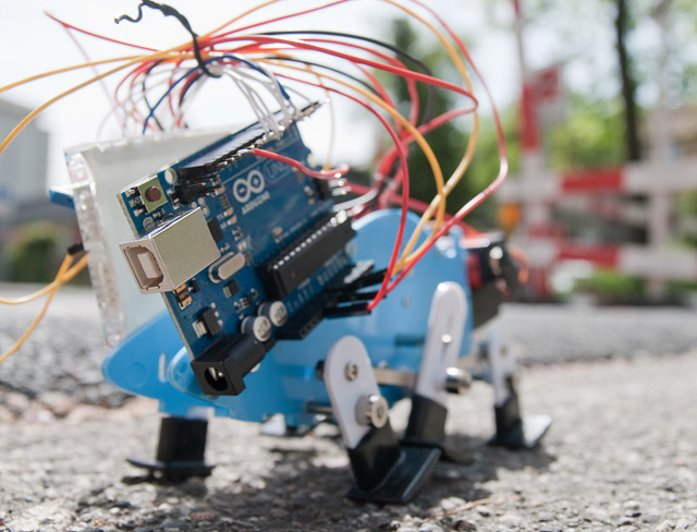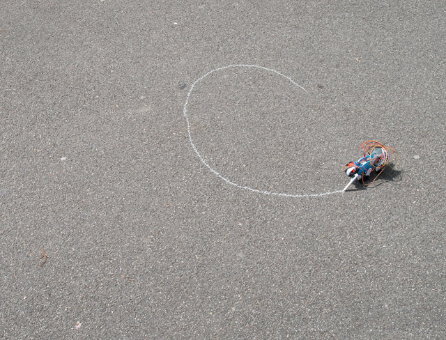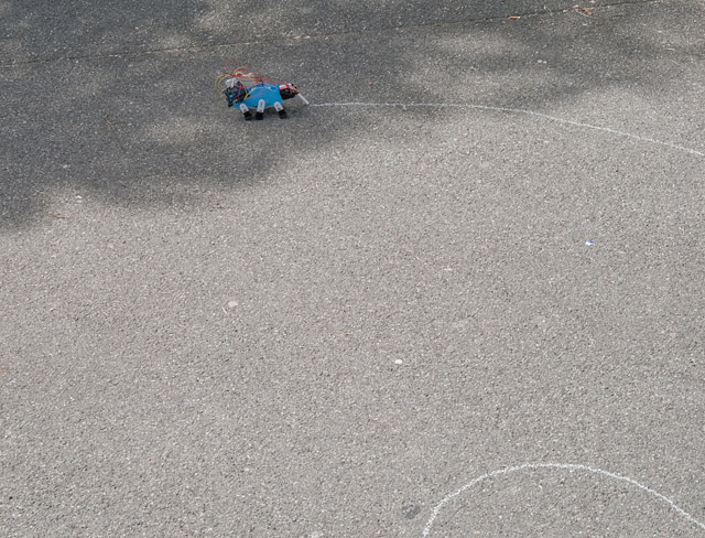Crapple is a walking robot which is able to draw fibonacci spirals with chalk. The robot interacts in the urban space, creating traces on the floor. The two motors, one for each side, are driven by an Arduino. Each side can be programmed individually so the robot is able to move in a spiral, with different walking speeds of each motor. The angle and pressure of the chalk is controlled by a servo.