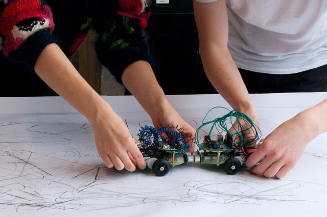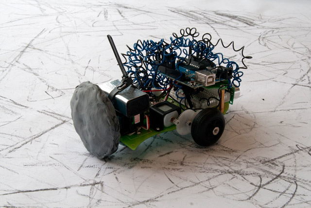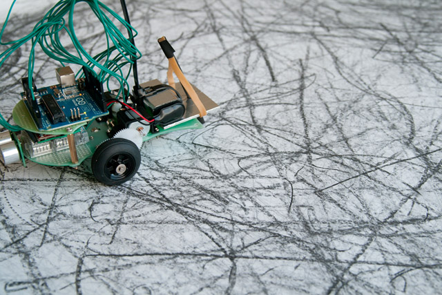 The setup consists of two machines with similar moving features. Both can move to all directions and use an ultrasonic collision control. The drawing machine has a charcoal mounted on its rear end, the cleaning machine uses a round and slowly spinning eraser to clear the marks. Furthermore they are sensitive to light. The drawing machine starts when it brightens up and stops in the dark, that’s when the cleaning machine comes to life.