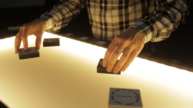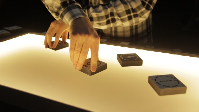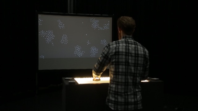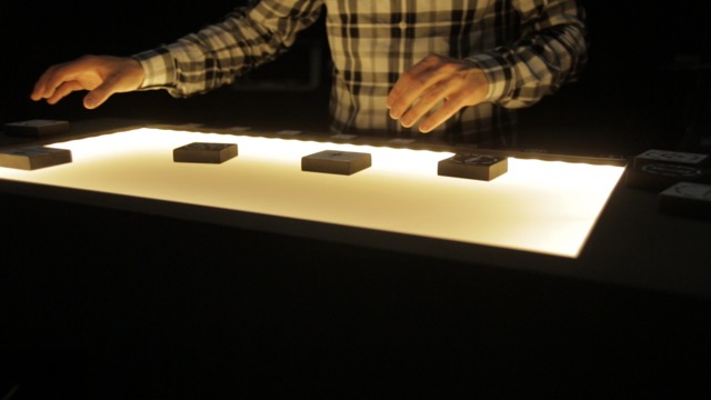 The «Tapir» is an interactive table project by Cyrill Studer and Katrin Deubelbeiss. It is running with reacTIVision, a computer-vision framework for table-based tangible interaction, and Processing, a programming language for visual output. By putting prepared objects on the acryllic glass surface, moving or turning them, the particles in the projection change their appearance and behavior. «Tapir» is a playful way to design and interact with your environment.